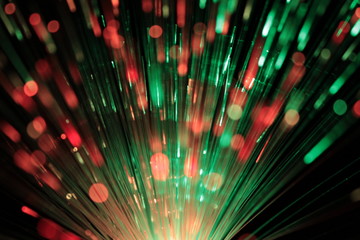 Close-up of a circuit board with glowing fibre optics representing data and innovation