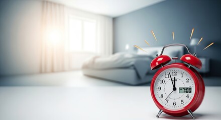 A red alarm clock with a white face and black numbers and hands, standing on a white table in a modern bedroom with a gray wall and white curtains.