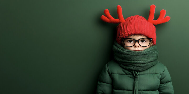 Serious child in winter clothes with red antler hat and glasses, Christmas theme
