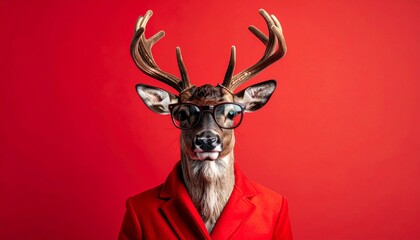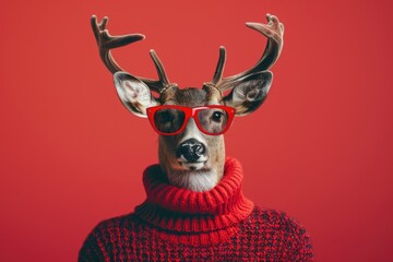 Portrait of deer wearing red eyeglasses and patterned sweater, standing against solid red background, animal facing camera with alert expression, humorous anthropomorphic concept