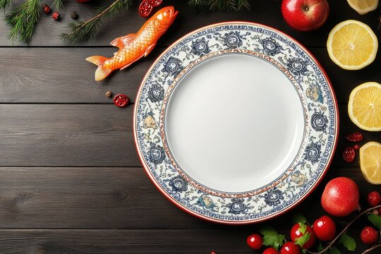 Festive Table Setting with Ornate Plate, Fruit, and Fish Decoration