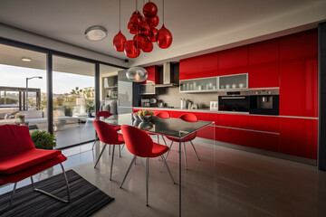 Modern spacious kitchen with red chairs and red kitchen furniture.