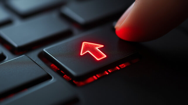 Finger pressing glowing Close up Macro Red Arrow key on a black computer keyboard