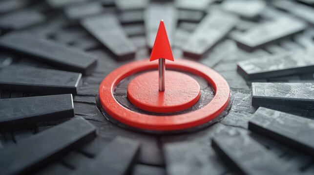 Metallic-edged red arrow pointing upward and rightward, signaling direction against transparent backdrop, emphasizing key visual guidance