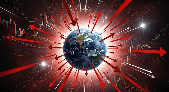 Red graph arrows overlaying globe and cityscape indicating economic growth