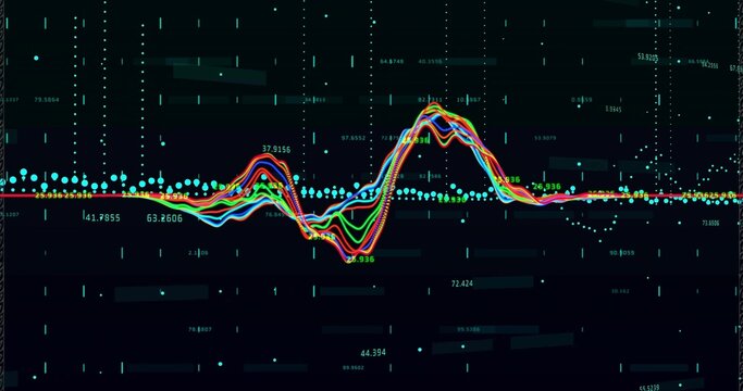 Displaying multicolored waveform oscillating on grid dashboard, with teal axis and floating numbers