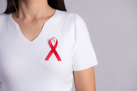 Closeup of red badge ribbon on woman chest to support AIDS Day. Healthcare, medicine and AIDS awareness concept.