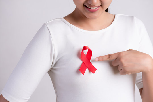Closeup of woman hand pointing to red badge ribbon on chest to support AIDS Day. Healthcare, medicine and AIDS awareness concept.