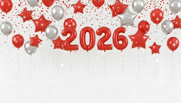 New Year 2026 red balloons celebration background