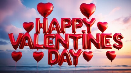 Happy Valentine's Day text with red heart shaped balloons. Love,sunset with beach background