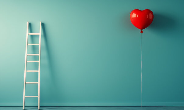 Ladder reaching to red heart-shaped balloon on blue background with space for text