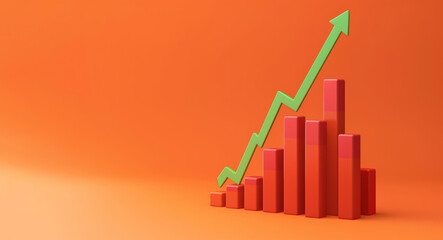 A green arrow graph rising on a red bar chart against an orange background. Ideal for business growth, success, and positive trends.