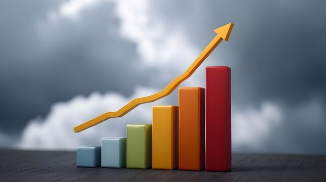 A vibrant 3D bar graph displays increasing business growth and upward trends symbolized by a prominent arrow against a dramatic cloudy sky