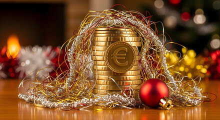 A stack of gold euro coins with festive christmas decorations. Holiday spending and finance concept. Warm background with a fireplace and red bauble