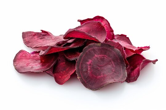 Red beet chips arranged in a pile on a white backdrop with space for text or images.