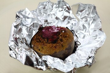 Raw red beet prepared for baking in the oven. Red beetroot wrapped in aluminum foil for cooking