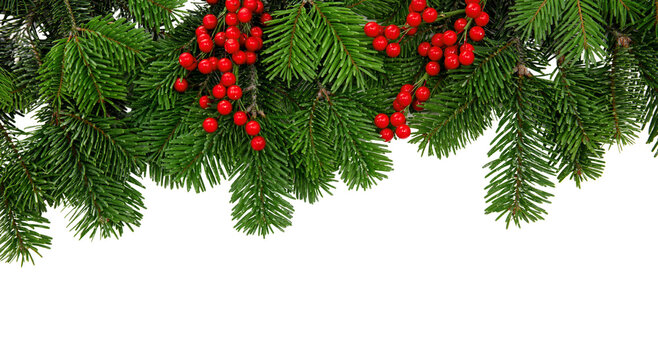 Christmas tree border and red berries decoration isolated on white transparent, PNG.
