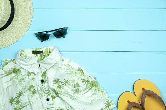 Straw hat, sun glasses, shirt, flip flops on light green wooden background.
