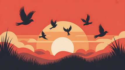Dramatic crimson sunset silhouette with tall grasses, flying birds and reflective water