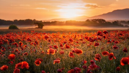 breathtaking poppy field at sunrise with warm golden light and vibrant red blooms