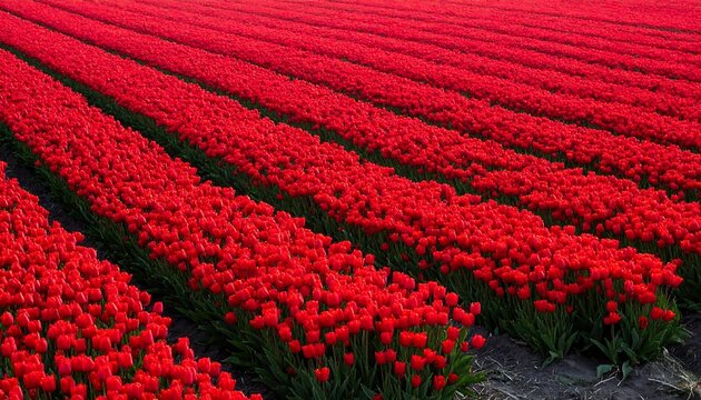 A garden filled with vibrant tulips shows a mix of red blooms and a single yellow flower standing out. The scene captures the essence of a spring day in full bloom.