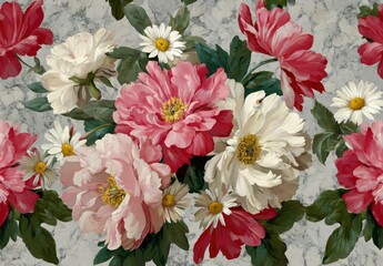 Floral artwork featuring pink, white, and red blooms with green foliage, set against a marbled background