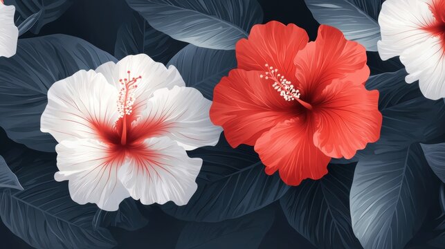 Digital illustration of three hibiscus flowers on a dark blue background. the flowers are white with red stamens and have a large, open center.