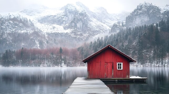 Misty Lake Red Boathouse Wooden Dock Foggy Scenery