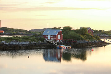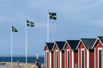Astol island near Tjorn in Sweden with red and white cottages, boats and blue water