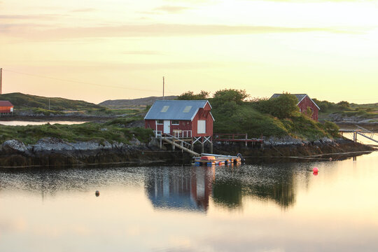 Vivid Red Boats and Blue Boathouses Reflecting in a Tranquil Harbor