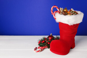 Saint Nicholas day. Red boot with treats and festive decor on white wooden table against blue background. Space for text