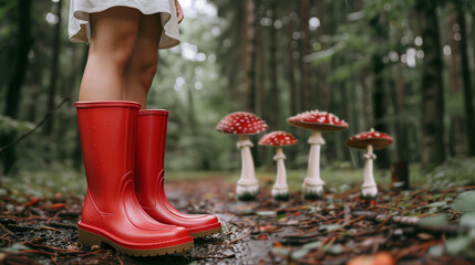 A woman with red rubber boots in the autumn forest after rain, four red mushrooms in the background.