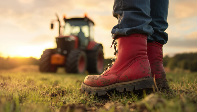 Farmer wearing red boots is standing in a field with a tractor in the background at sunset