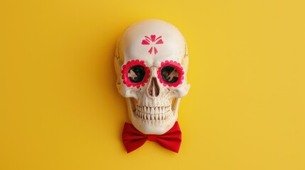 A vibrant bow tie with a colorful, abstract pattern featuring various shapes, dots, and figures.