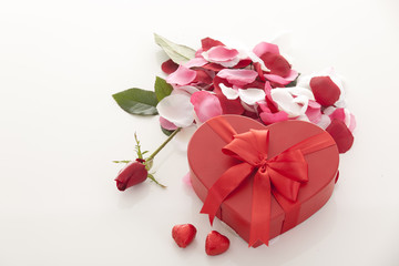 Valentines Day gift in red box with rose petal