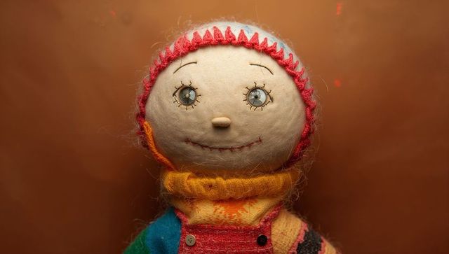 Handmade patchwork doll wearing red knit cap and scarf, button-eyed toy with stitched smile