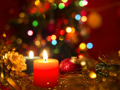 A red candle is burning. Red lights glow in the dark background. Festive lighting concept