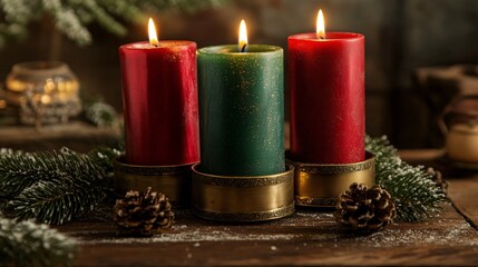 Festive christmas decorative handmade wooden heart with reindeer and lightning stars and red candlestick in the background