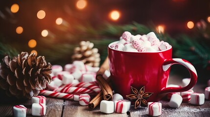 Hot drink with marshmallows and candy cane in red mug. Fir cones, spices in the background. Cozy seasonal holidays