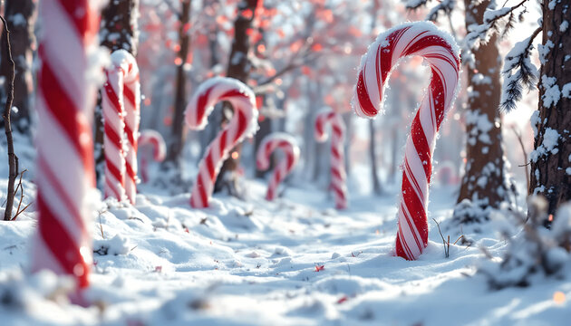 Whimsical gingerbread house surrounded by candy canes in snowy wonderland