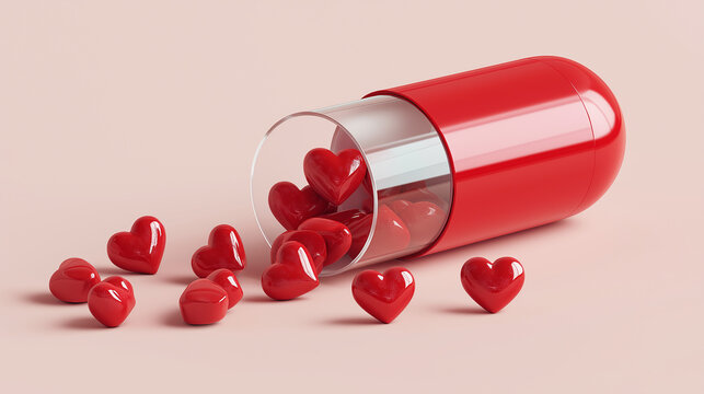 A vibrant red capsule spills heart-shaped candies, symbolizing love and affection against a soft pink background.