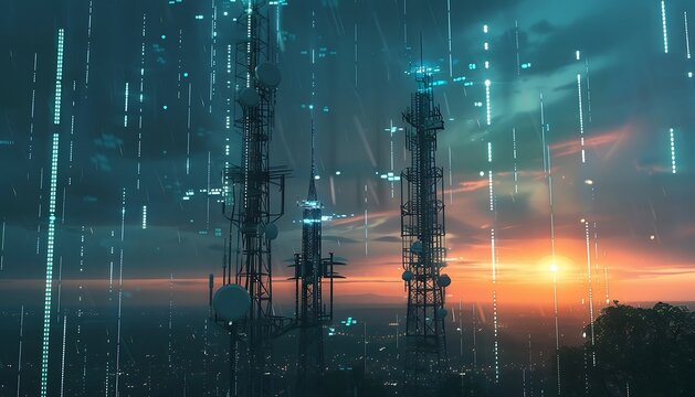 Elegant A high speed 5G network visualized with glowing blue and red waves radiating from a cell tower representing ultra fast data transmission