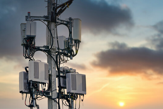 The silhouette of a cell phone tower stands against a dramatic sunset sky. The red warning light at the top of the tower is on.