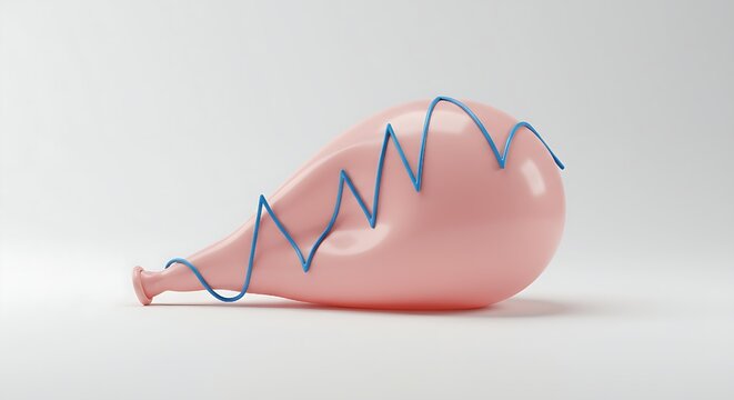 A deflated blue balloon with a glowing red chart line on its surface serves as a powerful creative concept for a downturn in the economy, symbolizing market decline, business failure, and financial cr