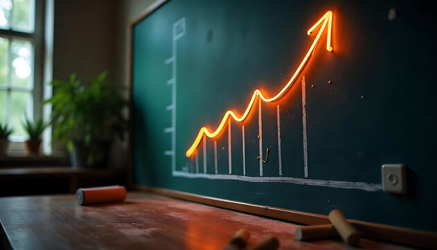 Semi-transparent cyan bar chart with red trend line overlaid on corporate boardroom table