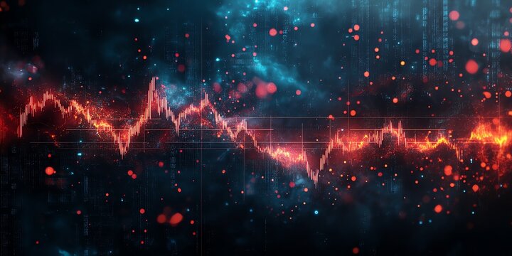 On a dark digital screen there is a red chart showing the rise and fall of the stock market. Bright graph on a dark background. Business, investment concept.