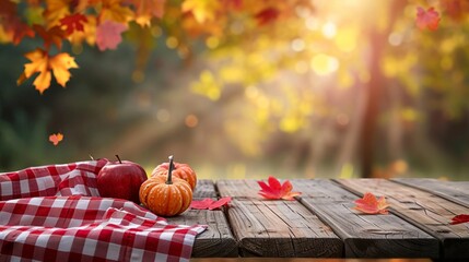 Red checkered tablecloth with white squares centered on a rustic dark wooden surface showcasing a textured finish and visible wear marks.