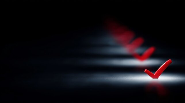 A series of red check marks shine in the dark. The bright colors contrast with the shadows to create a sense of achievement. Ideal for concepts like approval and progress. AI