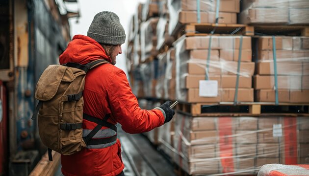 Person in red checking inventory at depot