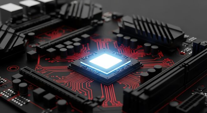 Abstract Circuitry:  A captivating macro shot reveals intricate red circuitry and a gleaming black square chip, embodying the power and complexity of modern technology.
